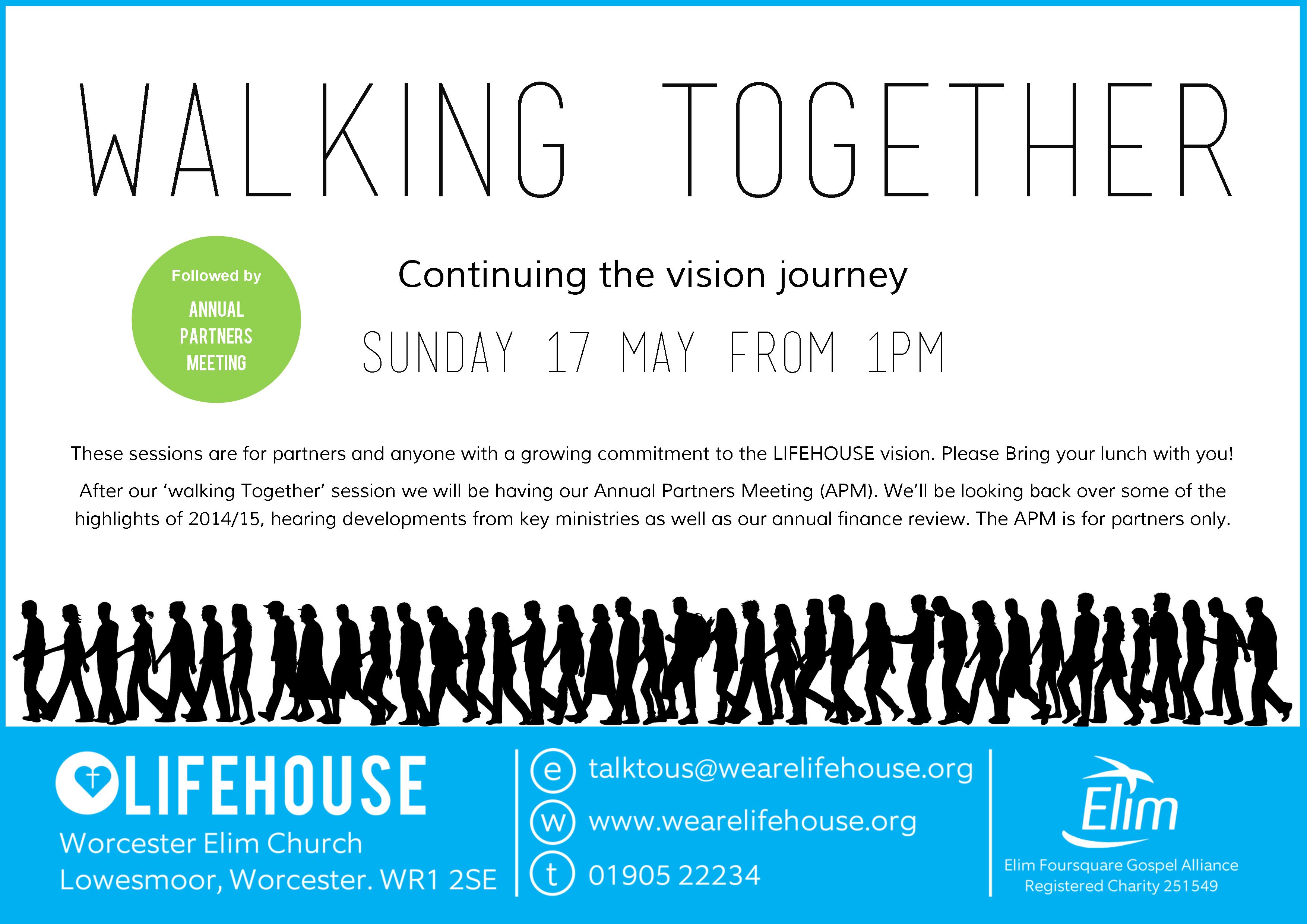 Our next ‘Walking Together’ will be on Sunday 17th May following the morning gathering and after we’ve had lunch together. Towards the end of this session we will move into our annual partners’ meeting (for partners only).